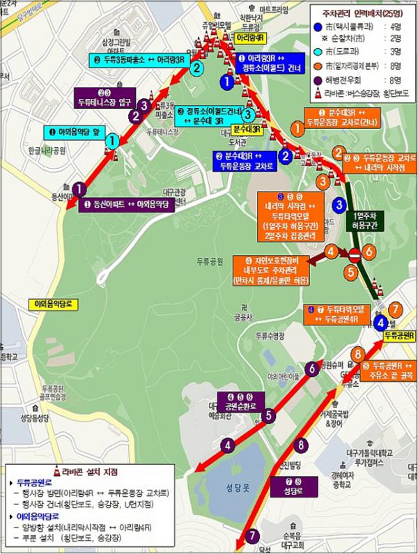 많은 방문차량에 비해 주변 주차공간이 부족함에 따라 두류공원로 및 야외음악당로 일부 갓길을 임시주차장으로 허용할 예정이지만, 절대 주차 금지구역 및 2열주차는 순찰차 운영 및 계도인력을 배치하여 집중 단속할 계획이다.