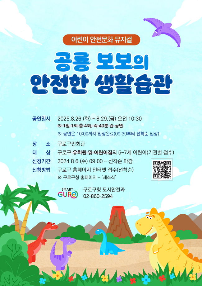 구로구가 어린이 안전교육 뮤지컬 ‘공룡 보보의 안전한 생활습관’을 개최한다.
