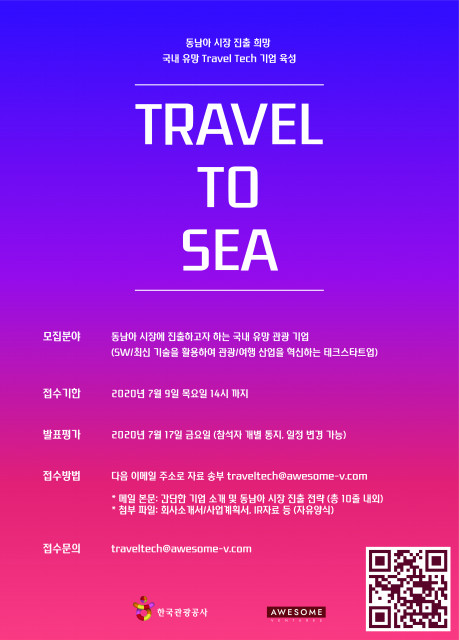 한국관광공사는 국내 유망 관광 기업의 동남아 시장 진출을 돕는 글로벌 챌린지 프로그램 ‘트래블 투 씨(Travel to Sea)’ 참여 기업을 모집한다고 18일 밝혔다. 문화체육관광부가 주최하는 이번 프로그램은 한국관광공사가 주관하고 어썸벤처스가 운영을 맡는다.
