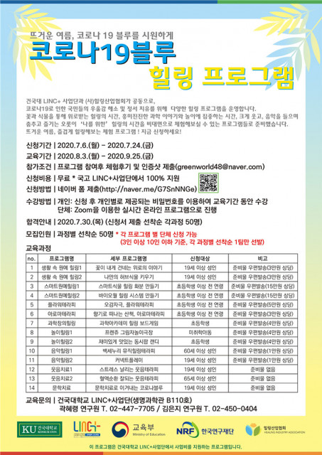 건국대학교 LINC+사업단과 힐링산업협회가 코로나19 사태 장기화로 피로감을 호소하고 있는 국민들의 정서 치유를 위해 힐링 프로그램을 개설해 운영한다.