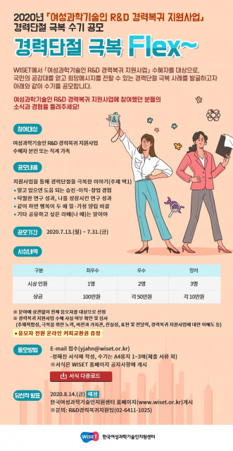 한국여성과학기술인지원센터(소장 안혜연, 이하 WISET)는 국민 공감대를 형성하고 경력단절 극복 희망을 전달하기 위해 7월 13일(월)부터 7월 31일(금)까지 ‘2020년 경력단절 극복 수기 공모전’을 실시한다.