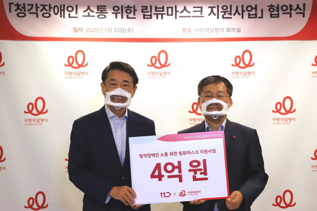 청각장애인 지원 사단법인 사랑의달팽이(회장 김민자)와 커머스포털 11번가(사장 이상호)가 코로나19로 소통에 어려움을 겪는 청각장애인을 위해 15일 립뷰마스크 지원 업무 협약을 맺었다.