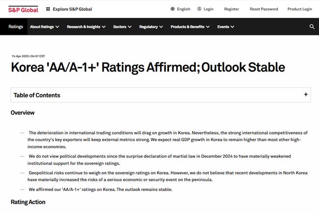 국제 신용평가사 스탠더드앤드푸어스(S&P)는 한국의 국가신용등급과 전망을 `AA, 안정적`으로 유지한다고 발표하며, 최근 정치적 불확실성에도 불구하고 한국의 제도적 안정성과 재정 건전성, 대외 수지 등을 긍정적으로 평가했다고 16일 밝혔다.